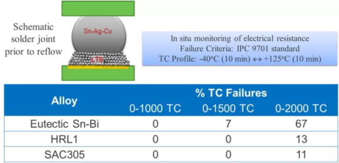 在合金中加入銀是改變共晶錫鉍合金微觀結(jié)構(gòu)和性能的一種最常用的方法。MacDermid Alpha電子解決方案公司對(duì)焊錫合金的廣泛研究沒(méi)有止步于此,他們還致力于開發(fā)具有更高熱可靠性和機(jī)械可靠性的低溫焊錫系列產(chǎn)品。經(jīng)過(guò)證明,SBX02焊錫(含微量添加劑X的無(wú)銀錫鉍共晶合金)的抗機(jī)械沖擊性能和熱循環(huán)性能,要比一般已知的42Sn58Bi和2Sn57.6Bi0.4Ag合金更高。最近,HRL1焊錫(一種非共晶錫鉍焊錫,含約2 wt.% (重量百分比2 %)的性能添加劑)表現(xiàn)出優(yōu)異的跌落沖擊性能和熱循環(huán)性能。如圖所示,這種新的LTS合金把最佳水平的鉍和正確的合金添加劑組合結(jié)合起來(lái),以提高合金的熱可靠性和機(jī)械可靠性。
