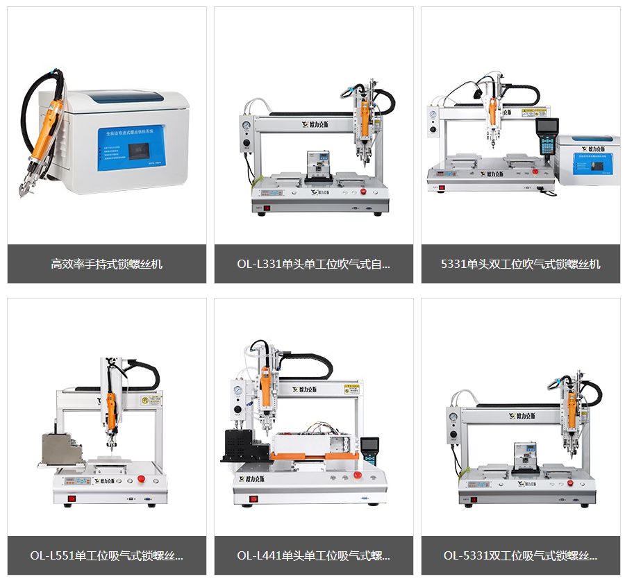 具備大型流水線、全自動(dòng)化生產(chǎn)線生產(chǎn)需求的在線式智能螺絲機(jī)、旋轉(zhuǎn)式自動(dòng)鎖螺絲機(jī)、搭配機(jī)械臂自動(dòng)擰螺絲的機(jī)械臂自動(dòng)鎖螺絲機(jī)!以及根據(jù)流水線生產(chǎn)需求不同定制的非標(biāo)自動(dòng)鎖螺絲機(jī)等等自動(dòng)鎖螺絲機(jī)!